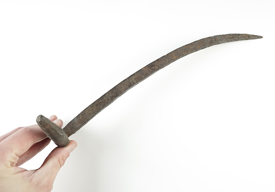Pictured here is a 12-inch forged iron root digging tool, traditionally used by Native American women to extract camas bulbs and other edible plant roots from the region’s rocky soil. Tools like this were essential for gathering food and reflect both cultural practices and adaptive use of traded materials.