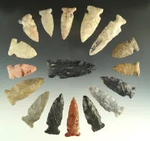 Set of 16 Assorted Archaic Period Arrowheads, found in Ohio, largest is 2 1/4". |