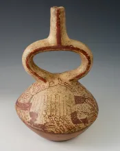 8 1/2" Wide Moche Dual Chamber Stirrup Bottle in nice condition, found in Peru. 200.00