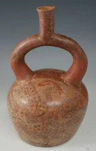 8" Tall Moche II Stirrup Bottle with painted exterior. Stirrup was broken off and restored back. |