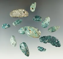 Set of 12 pre-Columbian beads and effigy pendant found in Mesoamerica. |