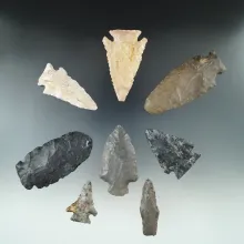 Group of eight assorted Midwestern slate artifacts, some are damaged. Largest is 3". |