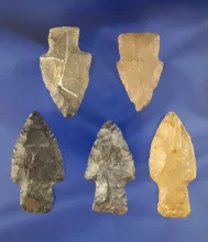 Set of 5 Archaic Stemmed points found in Ohio, largest is 2 1/8". |