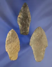Set of 3 Coshocton Flint Adena Arrowheads, largest is 2 9/16". Found in Ashland Co., Ohio. |
