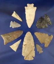 Set of 9 Assorted Ohio Flint Points, largest is 2 1/2". |