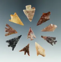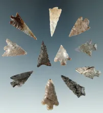 Group of 10 Columbia River arrowheads found by Norma Berg in Washington, largest is 1 1/8". |