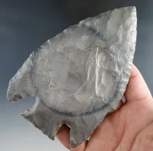 Huge! 5" Hornstone Hopewell with a large bull's-eye in material. Restoration to 1 1/4" of tip. |