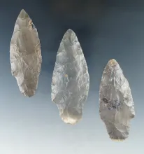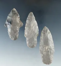Set of three Hornstone Nodena points, largest is 2 11/16". Found in Morgan Co., Indiana. |