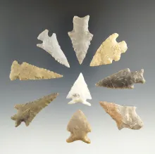 Group of nine assorted Texas arrowheads, largest is 1 7/8". | TEXAS | 150.00 | |