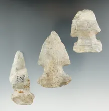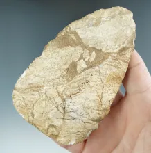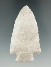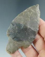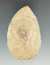 Excellent flaking and style on this 2 13/16" steeply beveled Archaic Thebes found in Indiana. INDIANA 90.00
