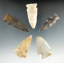 Set of five assorted arrowheads found in Rush Co., Indiana, largest is 2 11/16". | INDIANA | 50.00 | |