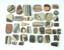 Set of 36 anciently salvaged pottery shards sanded into various shapes. All found in New Mexico. |