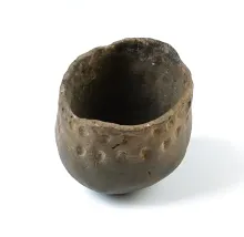 2 5/8" tall x 2 7/8" wide pottery jar in solid condition. Found at the Warren Site, New York. |