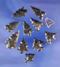 Set of 11 Obsidian arrowheads found in Oregon, largest is 1". |