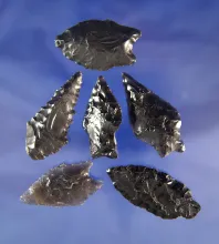 Set of six Obsidian arrowheads found in Nevada and Idaho in Oregon, largest is 1 3/4". |