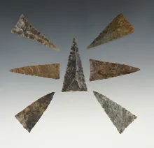 Set of seven very well-made Mississippian Triangle Points found in Tennessee. Largest is 1 9/16". TENNESSEE 230.00