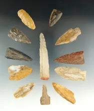 Group of 12 petrified wood knives and points found in Texas, largest is 3 3/8". |
