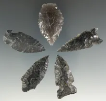 Set of five assorted Obsidian arrowheads found in Oregon, largest is 1 5/8". |