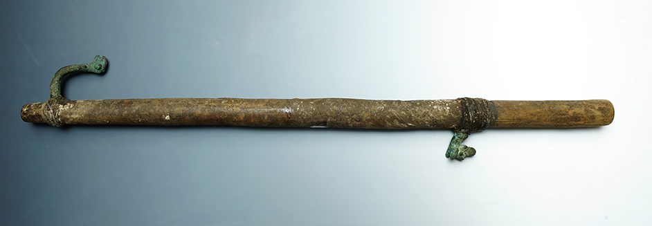 Very Rare! Original 15 1/2" long Precolumbian Inca Atl atl Thrower made from wood with effigy designed copper hook. Retains original textile thread wrap. Recovered in South America.