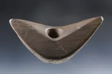Beautifully scooped bottom on this 3 13/16" drilled Boatstone - black Banded Slate. Ohio. OHIO 2,100.00