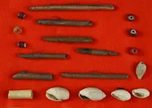 Beautiful set of eight stone and bone pendants found on Anasazi sites in Arizona. Largest is 1 13/16