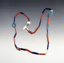 16" Strand of red, white and blue straw, tubes with stripes, shell and "Dutch" blue beads. NY. NEW YORK 90.00