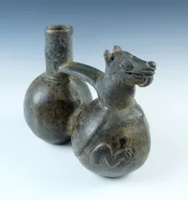 Beautifully decorated 6 3/4" tall by 5 1/4" wide Nazca Dual Spout Bottle, South America. |