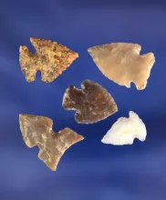 Set of five bird points found in Wyoming and North Dakota, largest is 13/16". WYOMING 35.00