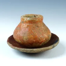Pair of Pre-Columbian pottery items including a 4 5/8" diameter plate and a 2 1/2" tall jar. Mexico.