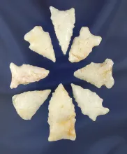 Set of eight assorted Quartz arrowheads found in Alabama, largest is 1 13/16". |