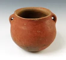 5" wide x 4" tall Casas Grandes Redware pottery jar with handles recovered in New Mexico. |