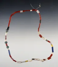 15" Strand of red, blue, yellow straw, wampum, red barrel and dutch blue Beads. New York. |