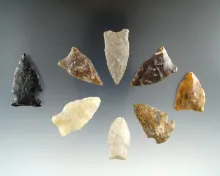 Group of 8 assorted Eastern South Dakota arrowheads, largest is 1 1/2". |