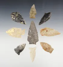 Set of 9 nicely made points found in the Eastern U.S. The largest is 2 5/16". |