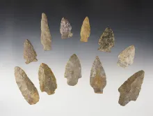 Set of 11 assorted points & knives found in various locations. The largest is 2 15/16". |