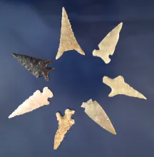 Set of seven assorted Arrowheads found in the southwestern U. S. Largest is 1 5/8". | 25.00 | ||