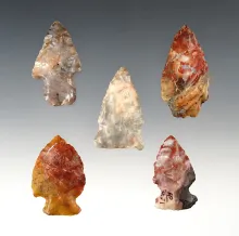5 highly colorful Ohio Woodland points made from Flint Ridge Flint. The largest is 1 3/4". OHIO 120.00