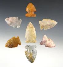 Set of 7 colorful Archaic Sidenotch points found in Ohio. The largest is 1 3/4". |