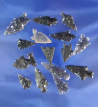 Set of 15 Obsidian arrowheads found in Oregon, largest is 1 3/16". |