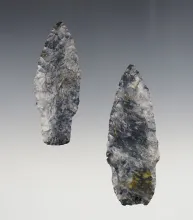 Pair of nicely made Adena points found in Ohio made from Coshocton Flint. Each has a Bennett COA. |
