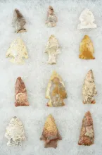 3 11/16" Archaic Cornernotch made from Hornstone. Found in Jay Co., Indiana. Ex. Cecil Cornell Colle