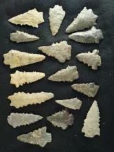 Excellent frame of 17 nice serrated Kirk points found in Kentucky. Largest is 3". |