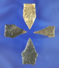 Set of four assorted arrowheads found in Kentucky. Largest is 1 7/8". One is uniquely salvaged. |