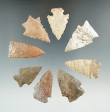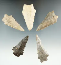 set of five serrated Kirk points found in Kentucky, largest is 2 3/8". Ex. Henry English collection.