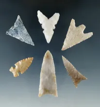 Set of six assorted arrowheads found in Texas, largest is 1 9/16". |