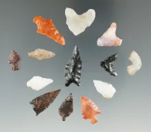 Set of 13 assorted arrow points found near the Columbia River, largest is 1 1/16". |