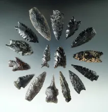 Set of 16 assorted flaked artifact from Oregon made from Obsidian, largest is 2 1/4". |