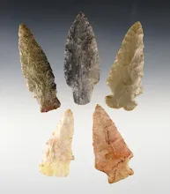 Set of 5 assorted points found in the Midwestern U.S. All are in very good condition. The largest is 3". |