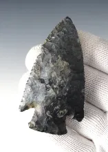 Classic style 3 1/8" Hardin that is thin and well flaked. Stem is nicely ground. Recovered in Illinois. |