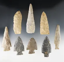 Set of 8 well made Indiana points in good condition. The largest is 2 5/8". |